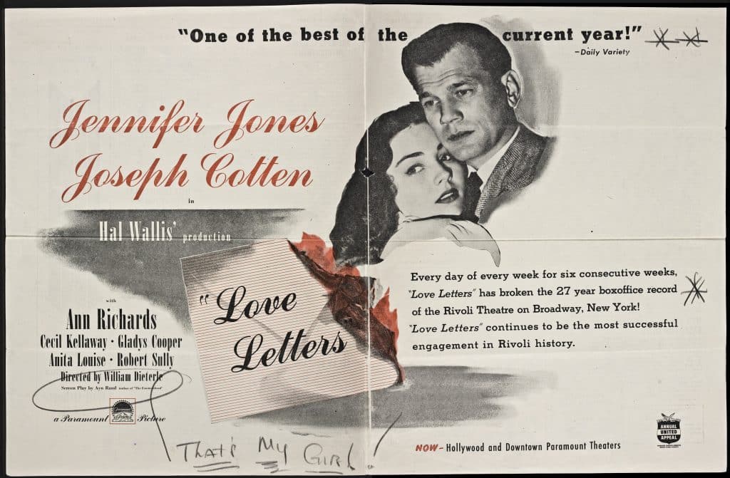 Magazine clipping from Daily Variety featuring an advertisement for the 1945 film Love Letters