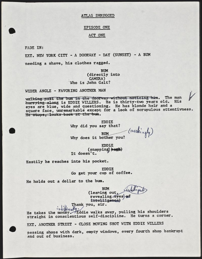 The first page of Atlas Shrugged teleplay by Stirling Silliphant, featuring handwritten comments and revisions by Ayn Rand