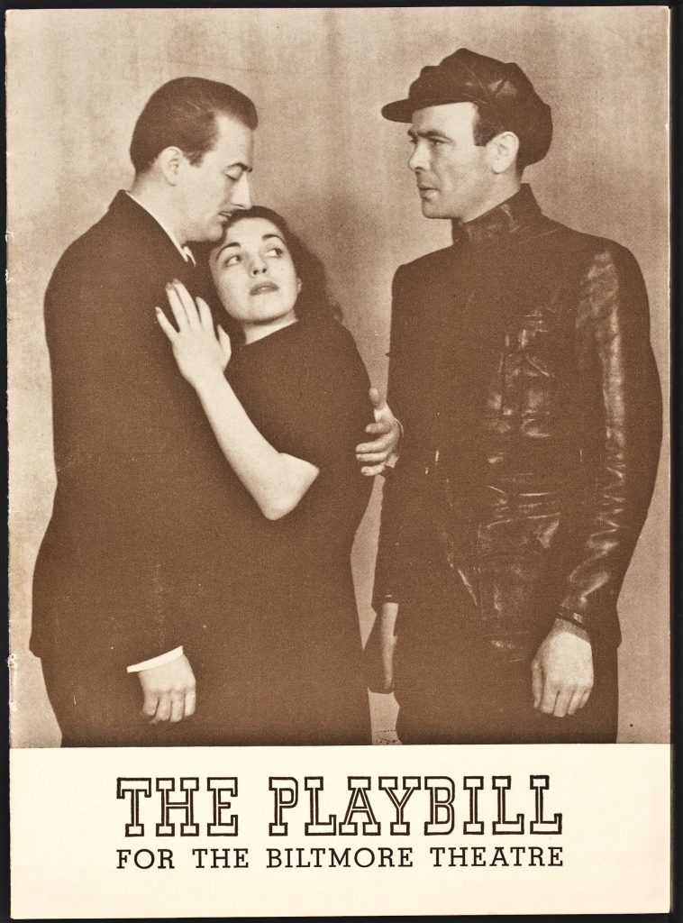 Playbill for The Unconquered at the Biltmore Theatre, directed by George Abbott. The cover features John Emery as Leo Kovalensky, Helen Craig as Kira Argounova, and Dean Jagger as Andrei Taganov.