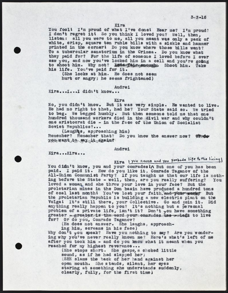 Playscript for the stage adaptation of We the Living (renamed The Unconquered)