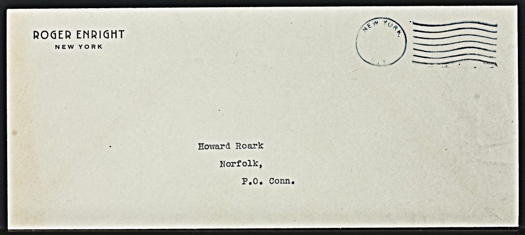 A movie prop used in the 1949 film The Fountainhead; an envelope addressed to Howard Roark from Roger Enright