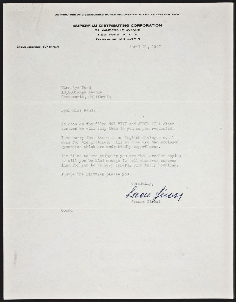 Ayn Rand received this letter from Cesare Girosi, a representative of Scalera Film, after requesting that she be sent copies of the unauthorized adaptation of We the Living.
