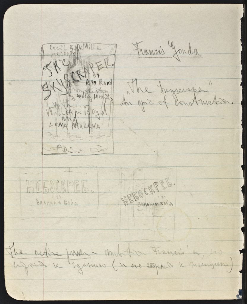 Soon after escaping to America in 1926, Ayn Rand was hired by director Cecil B. DeMille as a junior screenwriter. In a composition notebook, Rand imagined her story treatment brought to life on film, with a poster declaring: “Cecil B. DeMille presents The SKYSCRAPER by Ayn Rand: An Epic of Construction.” The hero of her story, Howard Kane, was originally named Francis Gonda, whose name appears on this page of her notes.