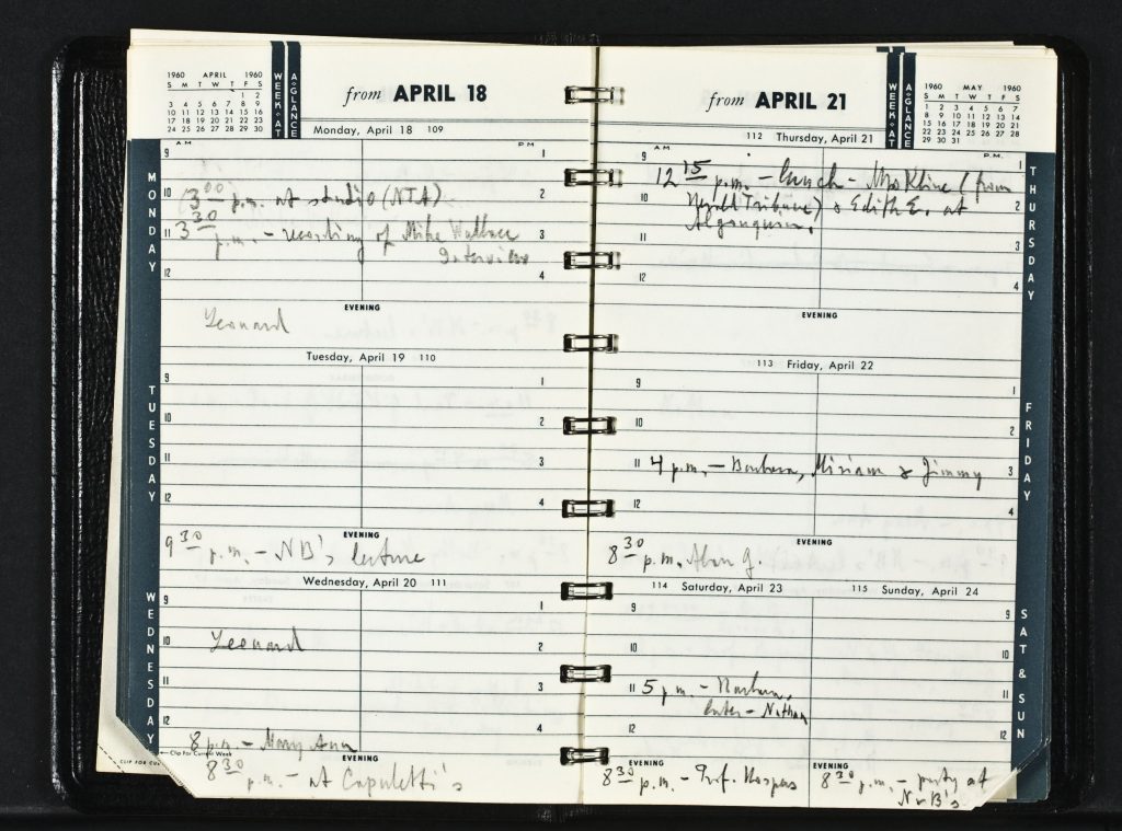 Ayn Rand’s Week-at-a-Glance spiral notebook calendar, 1960, featuring the filming date of Rand’s second television interview with Mike Wallace (top left)