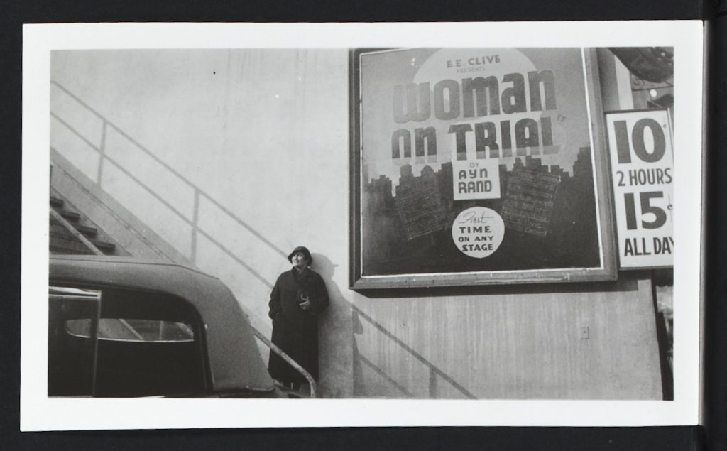 Photograph of Ayn Rand and poster sign for Woman on Trial on the south side of the Hollywood Playhouse