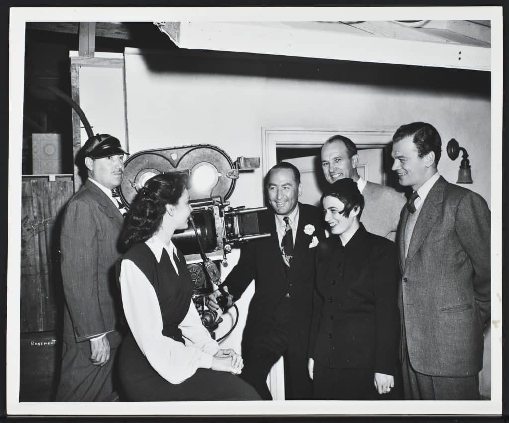 Ayn Rand on the set of Love Letters with cameraman Lee Garmes, lead actress Jennifer Jones, producer Hal Wallis, director William Dieterle, and lead actor Joseph Cotton
