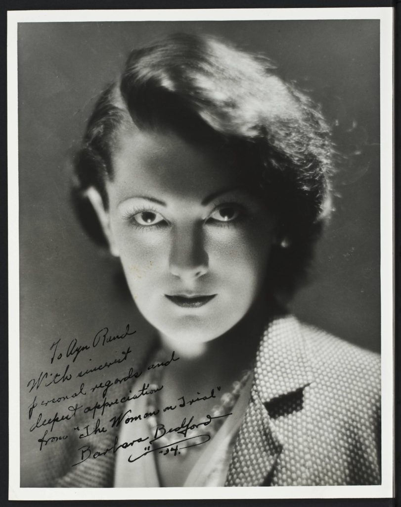 Signed photograph of Barbara Bedford as Karen Andre in Woman on Trial featuring an inscription to Ayn Rand: “With sincerest personal regards and deepest appreciation from ‘The Woman On Trial’”
